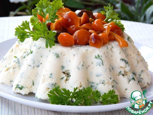 После того, как сырная масса хорошенько застынет, достаем ее из формы. Для удобства вынимания я перевернула форму и подержала на ней полотенце, смоченное в горячей воде. Заполняем отверстие маринованными грибами (лучше всего ассорти) и подаем к столу.