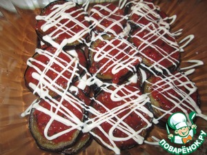 Берём высокое блюдо и выкладываем слоями. Баклажаны, помидорный соус, майонез.