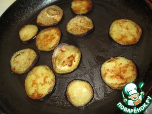 Баклажнаны нарезаем кружочками и обжариваем на растительном масле до готовности с обеих сторон