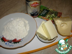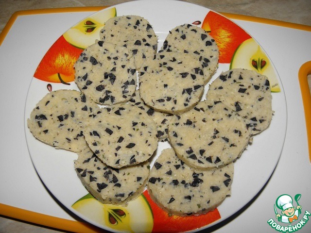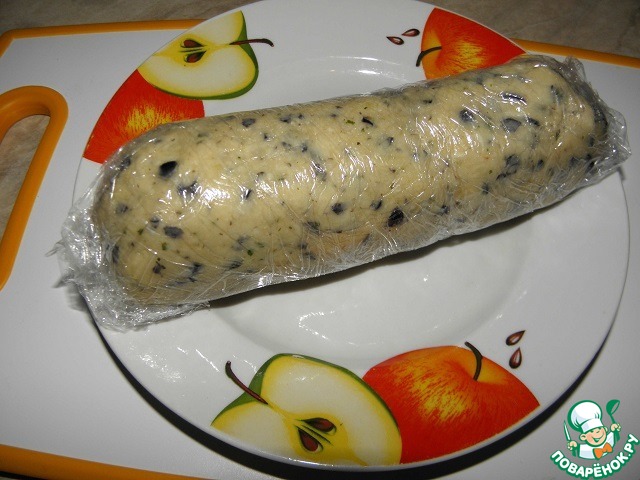 Перемешать сыр, маслины и сливочное масло., добавить соль, специи и муку. Сформировать колбаску, завернуть ее в пищевую пленку, и убрать в морозилку на 40-45минут
