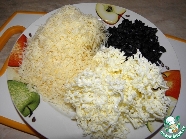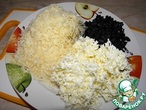 Маслины мелко порезать. Сыр и масло натереть на средней терке.
