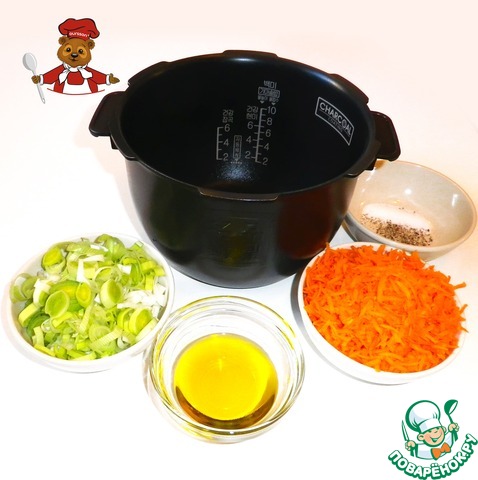 3. Обжарьте на оливковом масле лук-порей и морковку. Посолите и поперчите.
