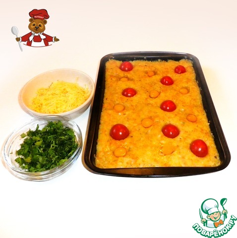 6. Выложите фарш в форму для выпечки. Разровняйте поверхность, сделайте углубления для томатов черри и перепелиных яиц. Добавьте в рыбный фарш томаты и разбейте сырые перепелиные яйца в углубления. Поверхность посыпьте тёртым сыром.