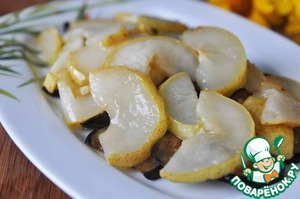 Берём сочную, спелую, твёрдую грушу, разрезаем пополам, удаляем сердцевину, нарезаем такими же кусочками, как и баклажан. Поливаем соком лимона.