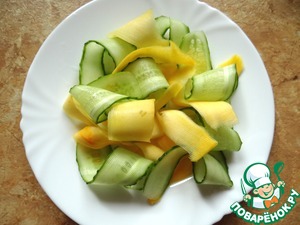 • Тыкву и огурец порезать на тонкие слайсы с помощью овощечистки, выложить в тарелку;