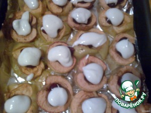Сверху вишен - ложку безе. И опять в духовку до готовности безе на маленький огонек минут на 30.