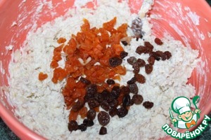 Следом добавляем курагу и изюм, хорошенько всё перемешиваем.