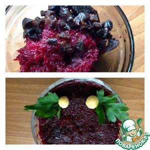 Свеклу натереть, чернослив мелко порезать и перемешать. Это наш последний слой. Украсить салат любимой зеленью и маленькими шариками из натертого сыра.