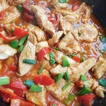 Нарезаем перец кубиками, помидоры ошпариваем кипятком и снимаем кожицу, так же нарезаем кубиками.