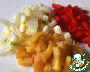 Имбирь, чеснок и красный жгучий перец чистим, мелко нарезаем. -