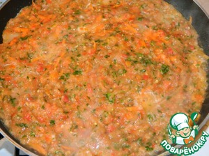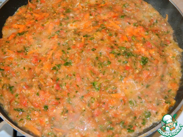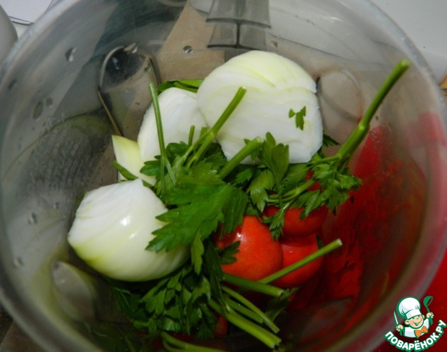 Отдельно в блендере измельчаем помидоры, лук, петрушку, соль, специи.