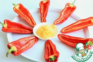 Перец (сорт капи) помыть, очистить от семян. Обсушить бумажным полотенцем. Разрезать перец вдоль, стараясь оставить хвостик. Сыр твердых сортов натереть на мелкой терке.