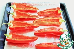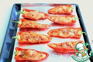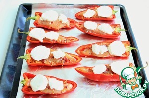Противень застелить фольгой и выложить половинки перцев. В лодочки перцев положить натертый сыр.