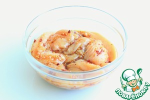 Далее готовим маринад. Для этого смешайте в миске соевый соус, мед, горчицу, "IDEAL" микс подсолнечного и оливкового масел и сушеную паприку кусочками.