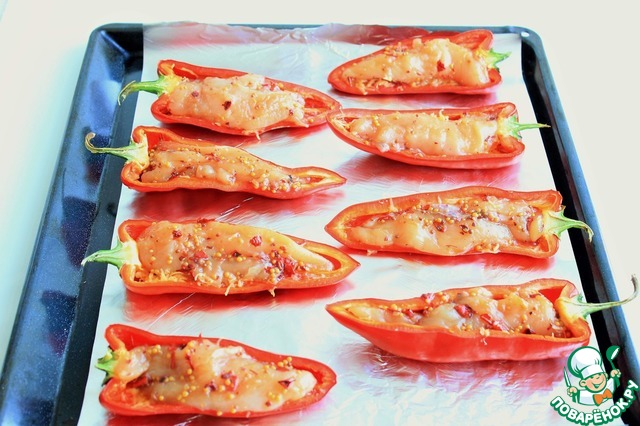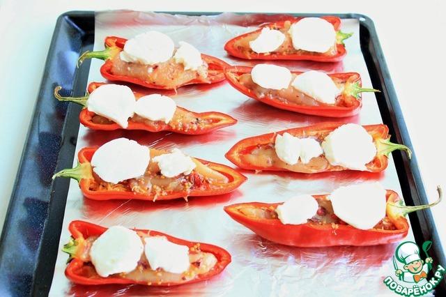 Выложите кусочки куриного филе в лодочки перцев, немного углубите.