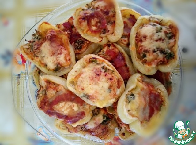 Перцы с курицей и сыром в беконе