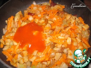 Томатную пасту развести водой, добавить в овощно-грибную смесь, перемешать и тушить под закрытой крышкой еще 10 минут. -