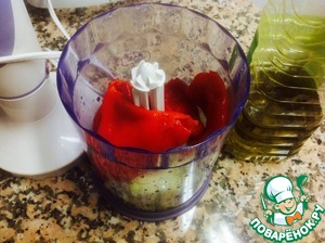Луковицу, печеный или консервированный болгарский перец с небольшим количеством оливкового масла измельчить блендером