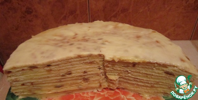 Раскаливаем сковороду и выкладываем наш корж, выпекаем с двух сторон. Они тонкие и жарятся быстро. Таким образом выпекаем остальные коржи (в итоге у меня получилось 10 коржей, еще 2 из обрезков). Всё коржи готовы.