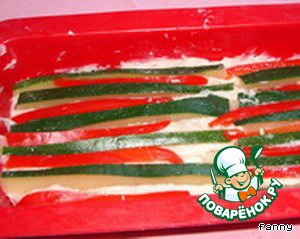 Снова покрыть слоем муслина и выложить следующий слой овощей - цуккини и перец.