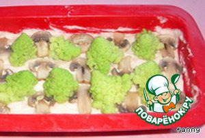 Морковь, цуккини и перец порезать в длину полосками, шампиньоны вымыть, порезать, подготовить соцветия капусты.