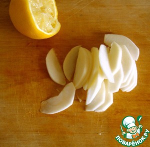 Яблоки очищаем от кожуры и сердцевины, режем тонкими ломтиками и сбрызгиваем соком лимона, чтобы не потемнели.