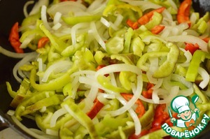 1. Нагреть сковороду налить масло, добавить перец, лук, и обжаривать на большом огне, овощи должны не тушиться, а жариться. Посолить, поперчить, добавить сахар. что бы карамелизовать лук и размягчить перец. Добавить уксус, обжаривать 3-4 минуты. Затем овощи вынуть, добавить нарезанный базилик и перемешать.