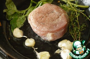2. Мясо помыть, просушить,. Посыпать приправами какие любите, у меня смесь перцев, посолить. В сковороду, где жарились овощи выложить мясо, туда же выложить раздавленный чеснок в шелухе, веточки тимьяна и базилика.