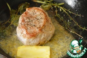 3. Перевернуть мясо, в сковороду добавить сливочное масло. Сковороду немного наклонить и маслом сверху поливать мясо. Мясо жарить по 5 минут с одной и другой стороны. Все зависит от толщины и от той степени прожарки какую любите.