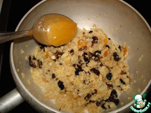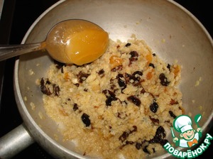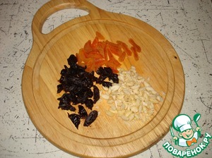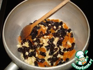 На сливочном масле обжарить изюм, курагу чернослив и миндаль.