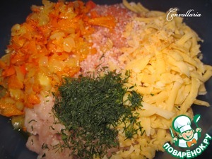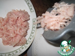 К куриному фаршу добавить мелко нарезанную зелень, обжаренные овощи и сыр, натертый на крупной терке. Посолить, поперчить и хорошо вымесить фарш.