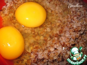 К остывшей гречневой крупе добавить яйца, соль и хорошо перемешать.