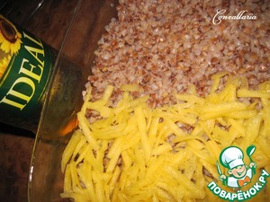 Форму для запекания (у меня 26 на 17) смазать растительным маслом, выложить половину гречки, затем половину тыквы, натертой на крупной терке.