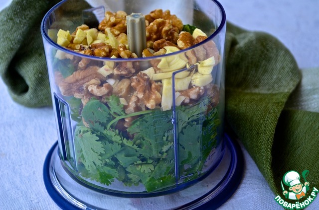 2. Кинзу, чеснок, орехи и уксус положить в блендер и прокрутить.