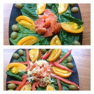 Семгу нарезаем на тонкие и небольшие слайсы, и выкладываем в центр тарелки. Болгарский перец очень тонко режем на полоски и выкладываем к салату.