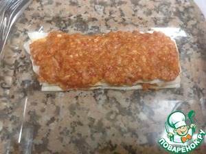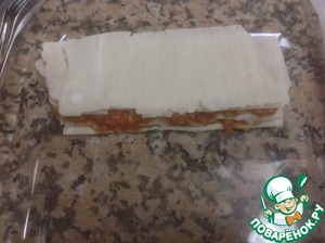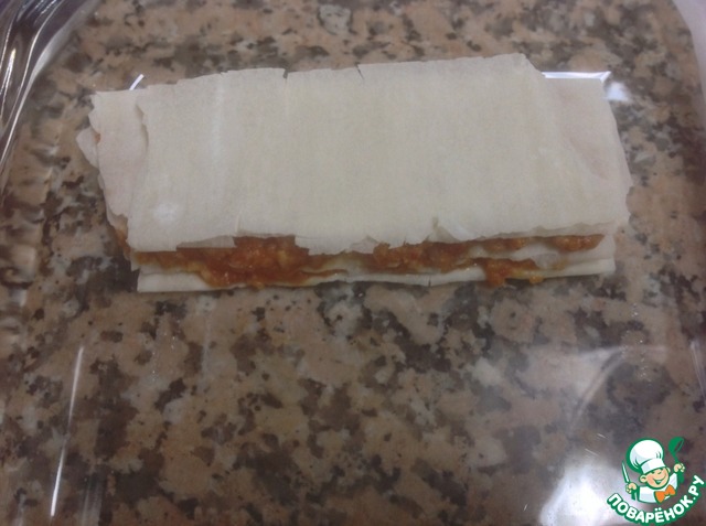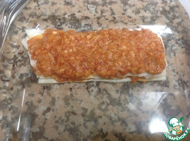 Разрезать тесто фило на порционные прямоугольники и выложить начинку