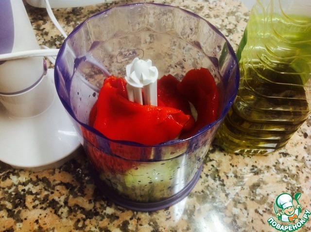 Луковицу и болгарский перец измельчить в блендере с добавлением небольшого количества оливкового масла