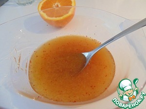 • Приготовить соус: выжать сок из половины апельсина. Смешать сок с коньяком и медом, добавить щепотку имбиря и красного перца.