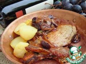 • Мясо переложить в огнеупорную форму, выложить лук и виноград, положить веточку розмарина, залить соусом, немного посолить, накрыть фольгой и поставить в духовку на полчаса.