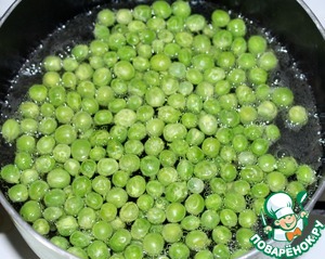 Зеленый горошек (лучше всего, конечно, брать свежий, но у меня замороженный) положить в кипящую подсоленную воду и варить 3-5 минут. Откинуть на дуршлаг.
