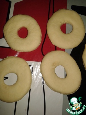 Когда тесто подойдет, раскатать его в пласт толщиной 3-4 мм и при помощи выемки или стакана вырезать кружки. В середине каждого кружка вырезать маленький кружок, можно это сделать при помощи пластиковой крышечки из-под газировки. Подготовленные пончики отставить для подъема приблизительно на 1 час.