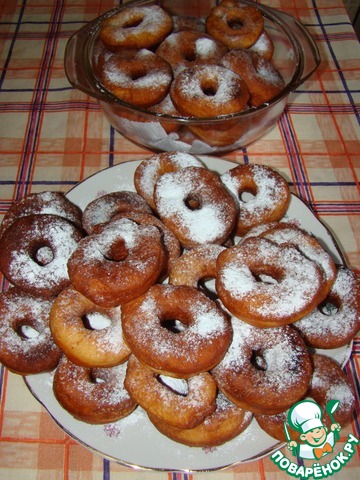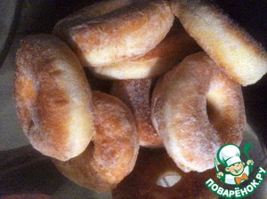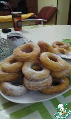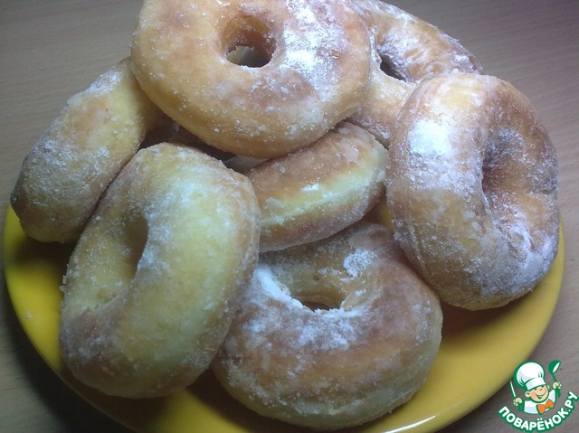 В глубокой сковороде разогреть растительное масло и аккуратно погружать в него подошедшие пончики. Обжаривать пончики донатс с двух сторон по 1-2 минуты с каждой стороны. После обжаривания выкладывать пончики донатс на салфетку для удаления остатков масла. Когда пончики донатс остынут сложить их в пакет, всыпать сахарную пудру, пакет скрутить или завязать и хорошо перетрусить. Пончики донатс должны равномерно быть посыпаны сахарной пудрой.