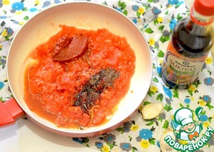 В сковородку выложить пюре из помидор, добавить томатную пасту, растительное масло, соевый соус, чеснок (выдавить через пресс) и чёрный молотый перец. Тушить 5 минут до испарения жидкости на 50%.