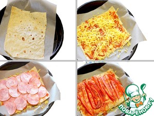 Лаваш разрезать на квадраты. Каждый квадрат смазывать томатным соусом. Каждый слой засыпать сыром, натёртым на терке. Выкладывать друг на друга, так-же как вы собираете торт. Один из внутренних слоёв прослоить ветчиной и сыром, другой - болгарским перцем и сыром.