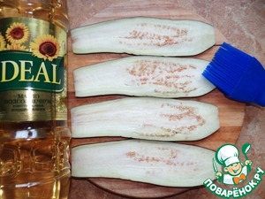 Тонкие слайсы баклажан обмазать маслом (1ст. л.) со всех сторон;