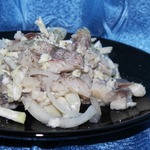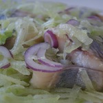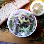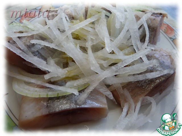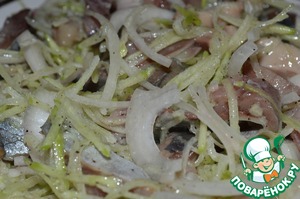 Селедку я вымочила в чае, чтобы была малосольной; зеленую редьку, небольшую, потёрла на некрупной терке для корейской моркови, залила водой с солью, через 15 минут отжала; порезала небольшую белую луковицу, залила её маслом, уксусом, посыпала сахаром, оставила на полчаса, потом слила жидкость. Подготовленную редьку, лук, нарезанную селедку смешала и полила маслом. Дала настояться 3 часа. Ну просто песня!