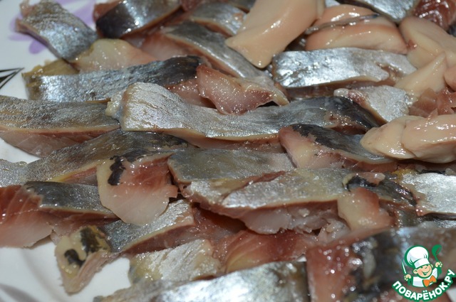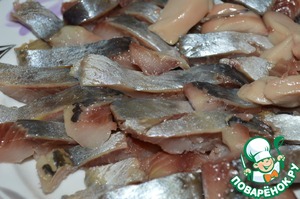 Сельдь разделать на филе, снять кожицу и удалить кости. Нарезать на полоски.