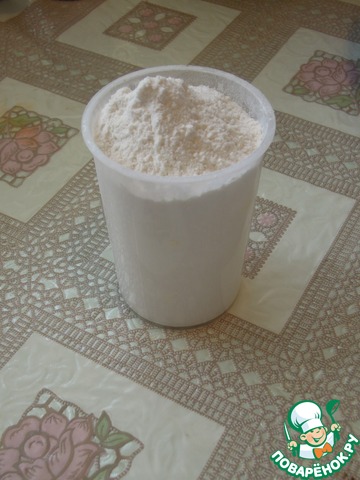 Всыпать муку. Отмеряю муку стаканом объёмом 300 мл.