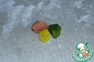 Крахмалом посыпаем стол и руки, перекладываем мастику на стол, продолжаем вымешивать (крахмал очень хороший помощник в работе с мастикой)