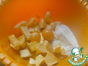 Отделить желтки от белков. В большой миске миксером взбить масло с желтками и сахарной пудрой.